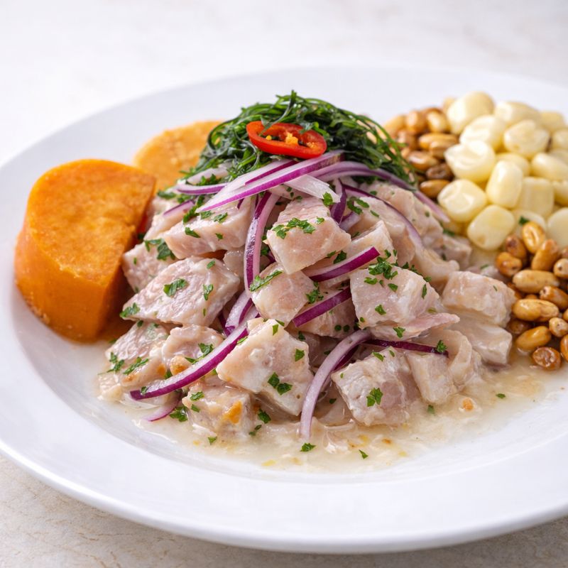 Pescado blanco fresco cortado en cubos, marinado al momento en jugo de limón, sal y ají (opcional), acompañado de cebolla morada en pluma y un delicado toque de culantro
