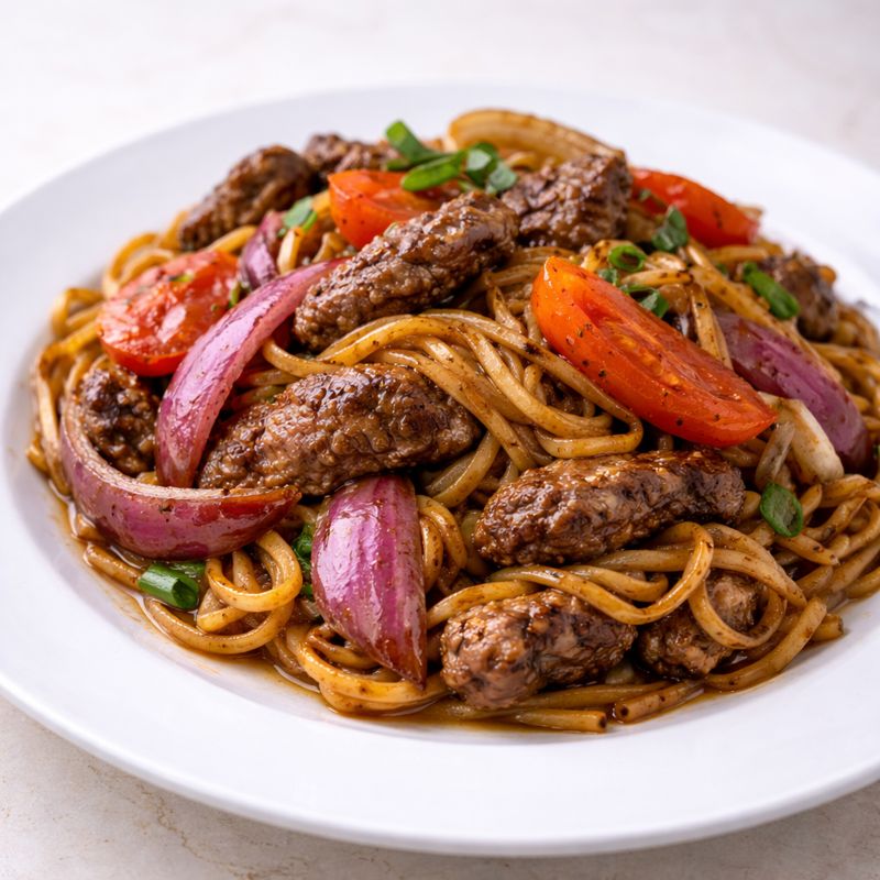 IMAGEN Jugosos tallarines salteados al wok con tiras de carne de res, cebolla morada y tomate fresco, envueltos en una salsa intensa de herencia chifa que concentra el fuego, el humo y el sabor del Perú criollo.